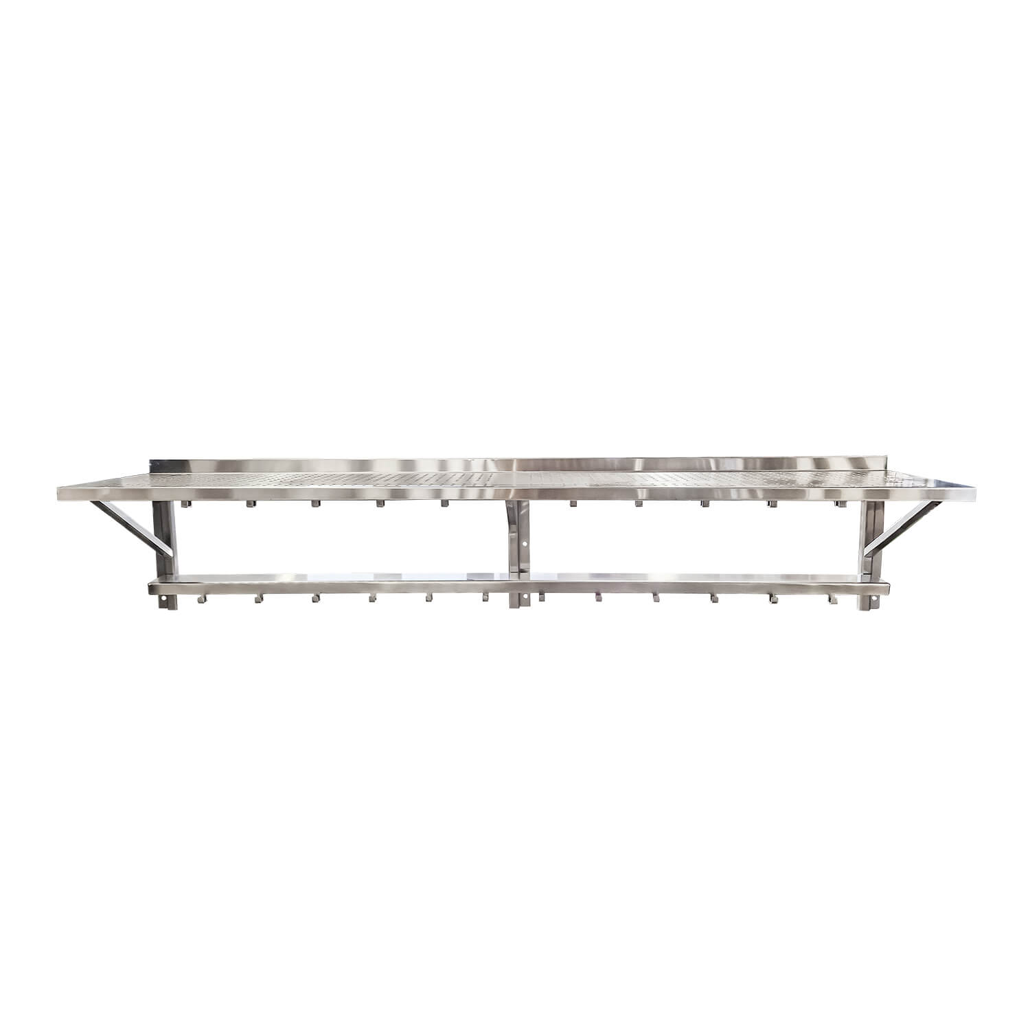 Stainless steel hat rack combines modern design and practicality. The top of the shelf is made of durable perforated plate, which adds style and allows good ventilation for the accessories stored. The perforated plate is easy to keep clean and is very resistant to moisture and heavy use. The hat rack also works as a coat rack, because there are enough hooks for several coats on different levels and the coats do not overlap each other completely.